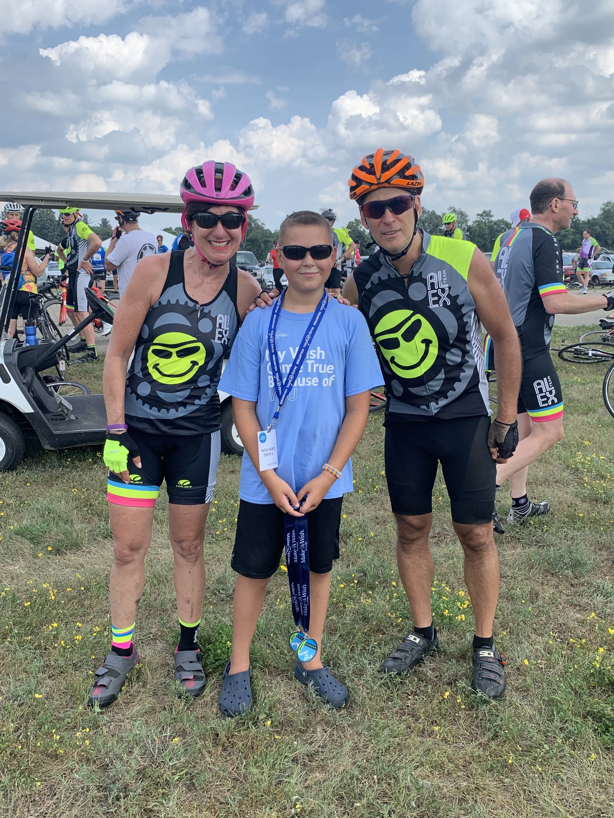 I joined Team Alex about 12 years ago because I didn’t want my husband to have all the fun! I was “Captain” of the 50-mile riders for a few years then decided to ride the 300! COVID kind of got in the way the last 3 years but, hopefully, this is the year! I love this family of choice and what we do for the Make-a-Wish kids! BTW, I’m the one in the middle between 2 of my favorite guys!